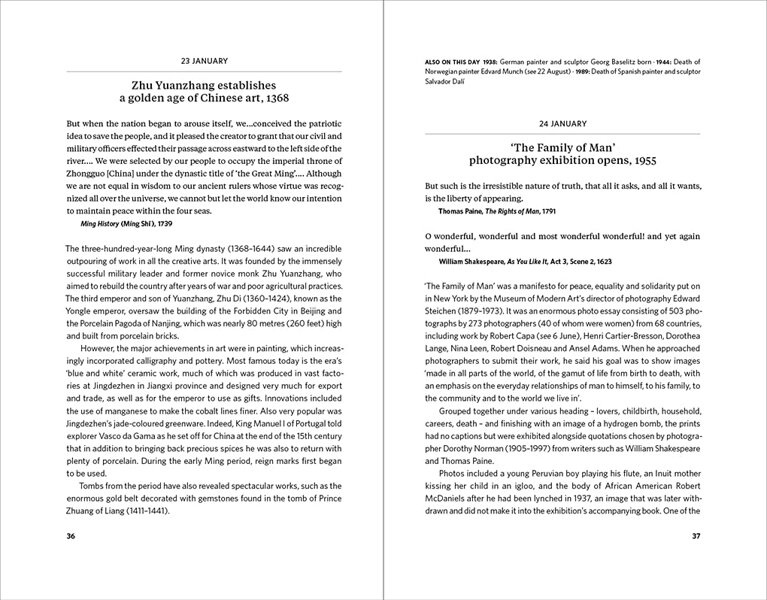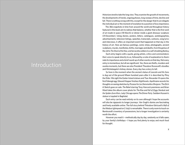 Art Day by Day presents snapshots of the most exciting, unusual and noteworthy art events from around the world and throughout history through direct testimonies, eyewitness accounts and contemporary chroniclers. Each day has its own section, starting with an extended quote giving artists, critics and commentators their voice to speak directly to us, followed by a brief explanatory text, and ending with other important events in art on that day e.g. births, deaths and exhibition openings.