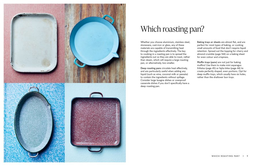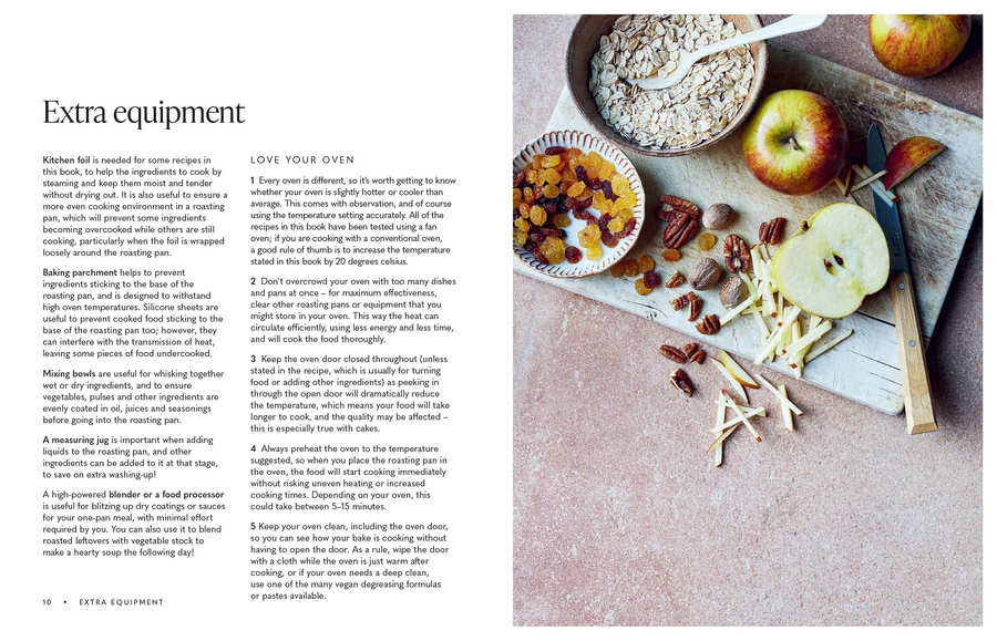 - Vegan Roasting Pan offers 70 oven-to-table recipes that are cooked in just one tin - a roasting tin, baking sheet or muffin tin, plus a few select pieces of preparation equipment.