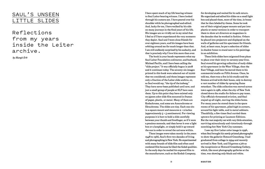 This volume contains works discovered through this process, specifically colour slides, never before published or seen by the public. Meticulously curated by Margit Erb and Michael Parillo of the Saul Leiter Foundation and supported by texts that explain how Leiter built the slide archive and how it is now being explored, catalogued and restored, this new monograph, presented in a real cloth binding, will be a must-have for photography fans worldwide.