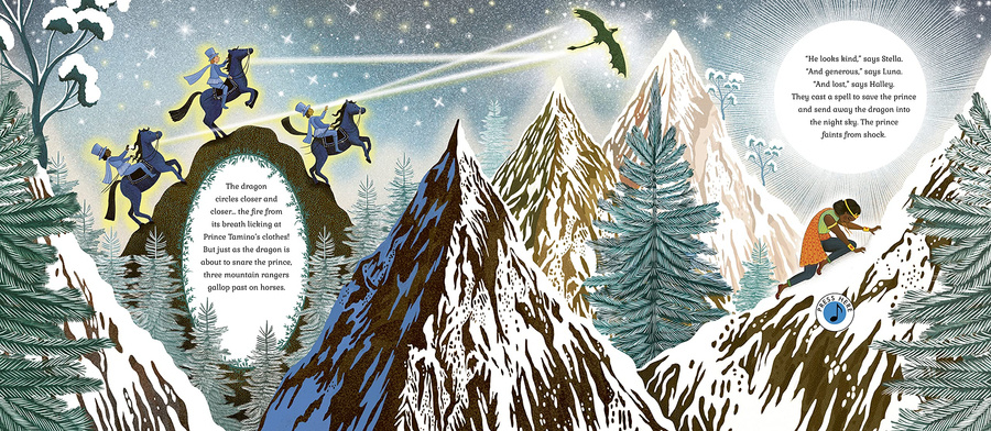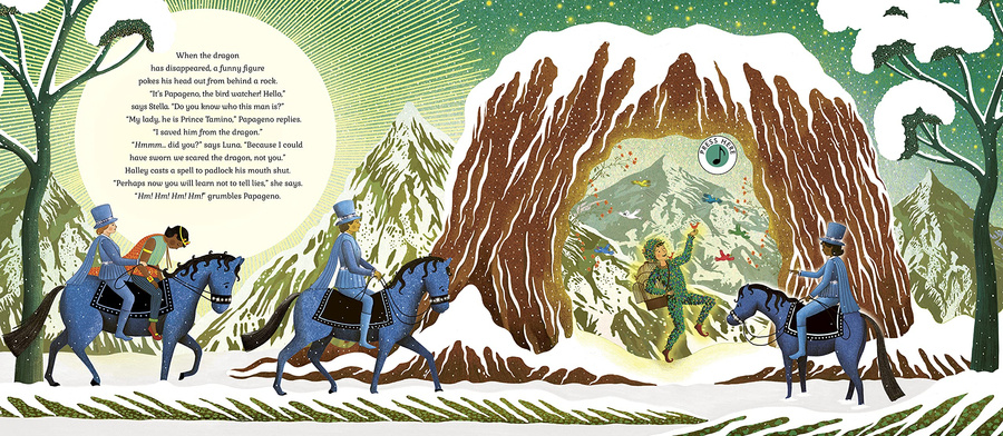 This classic opera, reworked for the benefit of younger readers, tells a tale of a prince, a princess and a magic flute, which begins in a mountain ridge between two magical lands. Prince Tamino enters, chased by a dragon, but three brave mountain rangers gallop past on horseback to rescue him.