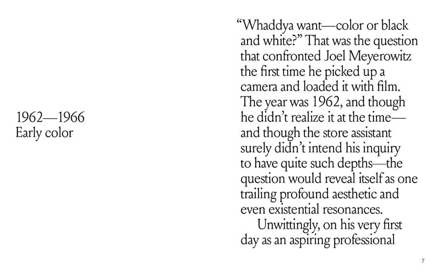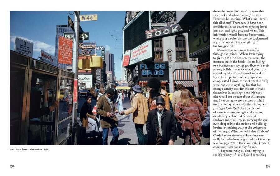 Just how, when and why US fine-art photographers switched from black-and-white image-making, which was prized within the gallery system, to colour photography, once seen as the preserve of the holiday snapper, has been the cause of much debate. In this book, Meyerowitz tells the story of his early days as a photographer when he was told that serious photographers took black & white pictures. 'But why?' he asked, 'when the world is in colour?' He proceed to buy a colour camera and various rolls of films and to read manuals and experiment with colour techniques: a passion he continued to pursue all his life...