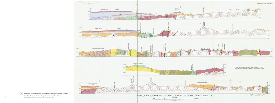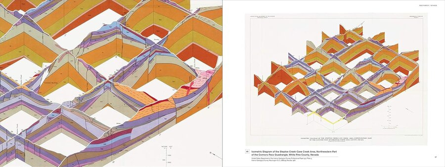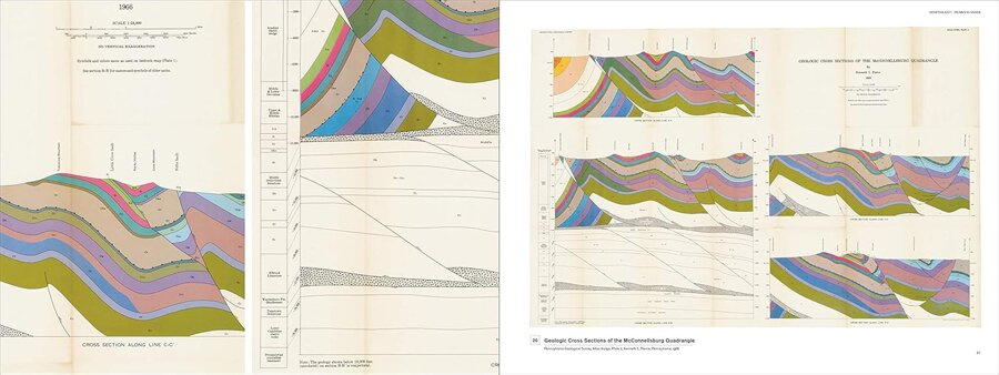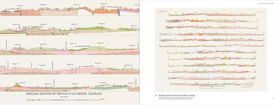 Each drawing tells a unique geologic story, exquisitely rendered in colors from pastel palettes to brilliant bolds that show evolving scientific graphic conventions over time. Created by federal and state geologists over the course of one hundred years, the maps reveal sedimentary rock layers that present an unexpected view of our treasured public lands, making this collection an important record of natural resources, as well as a beautiful display of map design.