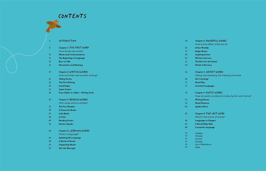 Divided into themed chapters, the book explores what words are and how humans communicate using spoken language and sign; the development of written scripts and writing implements, including paper; the history of manuscripts and printed books, including worldwide bestsellers and famous libraries; the process of learning another language; dialects and accents and the way language can reflect our identity; the power of words to calm, inspire, rally crowds and rule nations; graffiti’s role in spreading messages; codes and invented languages; the patterns of poetry; the future of words, including emojis; and languages facing extinction.