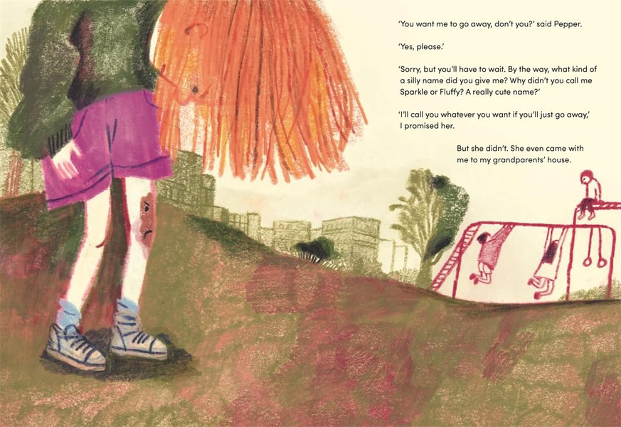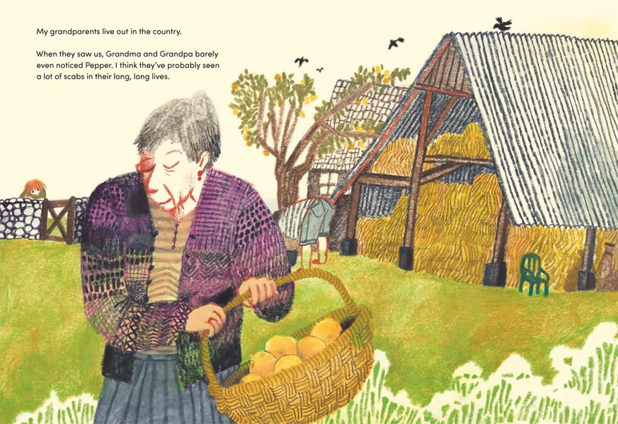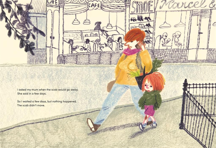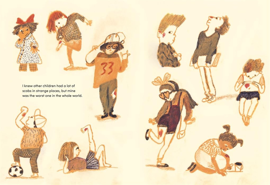 When a little girl falls on the street, scraping her knee, her father tells her not to worry, that 'a beautiful scab will form'. But she does worry! The scab is not beautiful and it's keeping her from bending her knee! When will it ever go away? By the time the scab - who she has named Pepper - falls off, something astonishing has happened: the girl has come to feel affection for the scab and has a hard time letting go.