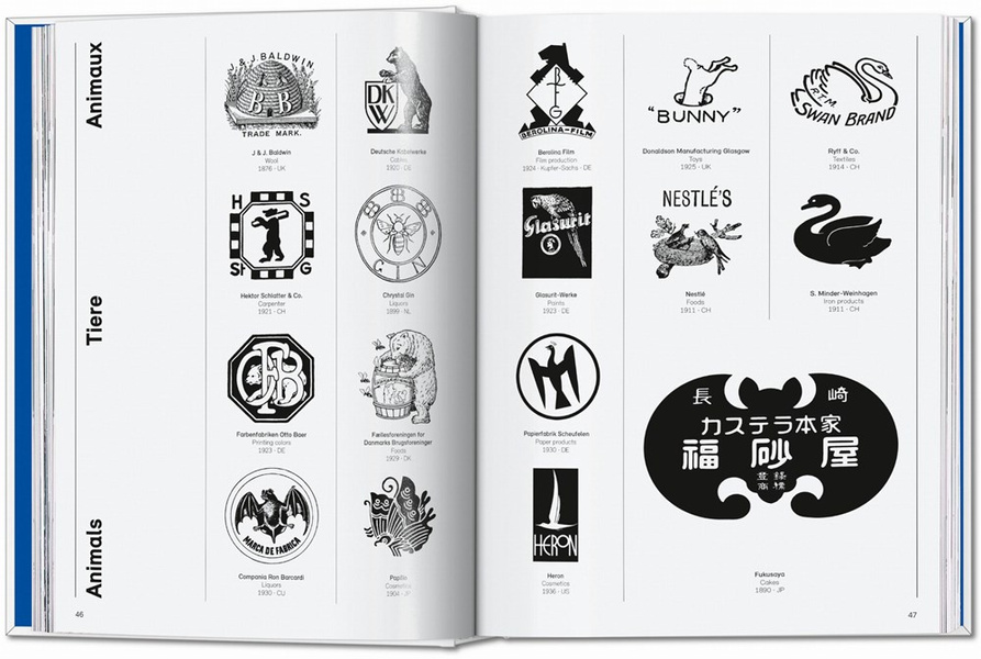 Bringing together two previous volumes—Logo Beginnings and Logo Modernism—into one compendium, design expert Jens Müller (dubbed “the logo detective” by Wired magazine) has trawled historical trademark archives and design publications to unearth 1000s of logos from as far back as 1870, including many forgotten designs and early versions of today’s brand identifiers. For clarity and ease of reference, both the Beginnings and Modernism sections are divided into categories (like Pictorial, Form, Effect, and Typographic) with each category further subdivided by basic design elements, like circle, line, alphabet, overlay, dots and squares.