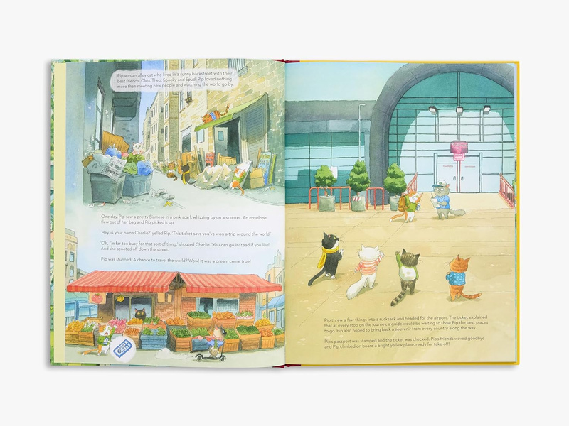 A beautifully illustrated ode to the wonders of travel, from the illustrator of Morris and the Magic of Stories. When an alley cat named Pip finds a ticket for a round-the-world trip that nobody wants, the scene is set for a globetrotting adventure. Follow Pip from Paris to Tokyo and from India to Brazil and beyond, and meet a wonderful world of international cats.
