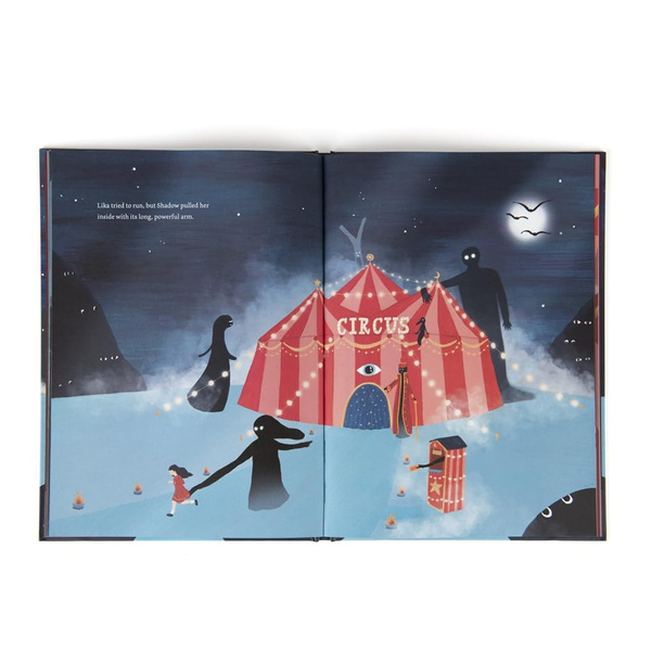 Lika hides in a darkened room, but the smaller she makes herself, the bigger Shadow becomes, until it picks her up and deposits her in a land of shadows, at the heart of which is a spooky shadow circus. Only by listening to her shadow will Lika find her way home. This is a book by the acclaimed author of The Grand Hotel of Feelings about accepting the parts of us that we try to hide from… Because where there is darkness there is also light, and when the shadows dance it is always a good idea to join the fun.