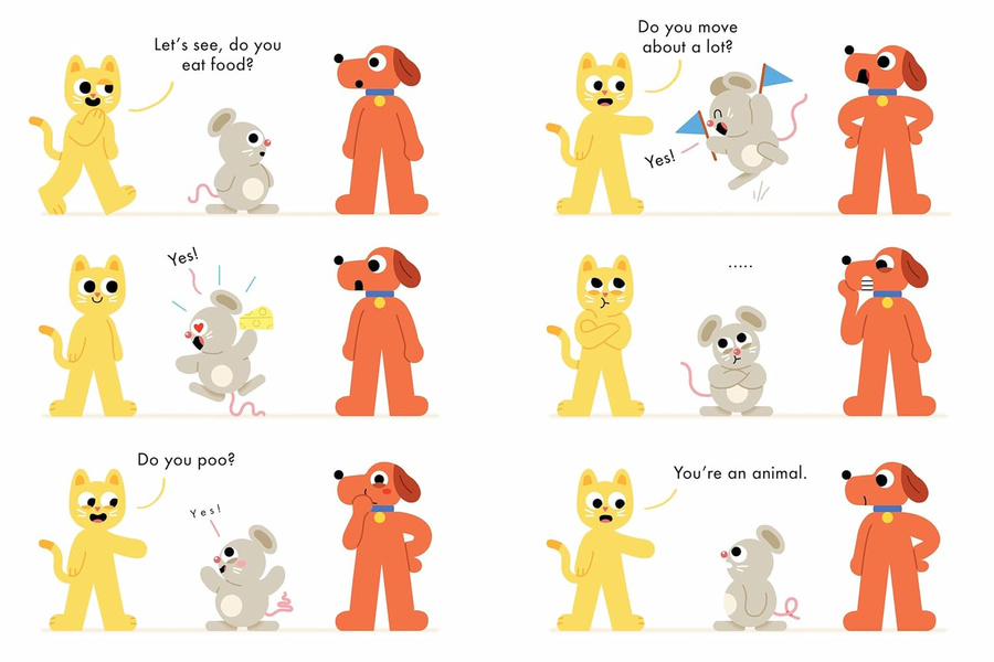 Cat comes along. ‘Do you breathe air? Do you eat and poo? Do you move around? You are an animal!’ But what kind of animal are they? As their identity crisis continues, more animals join the conversation, asking questions and narrowing down the possiblities until they eventually work out the answer. This is a silly, delightful book that nonetheless teaches an important lesson about using the scientific method to draw conclusions by observing, asking questions and eliminating possibilities.