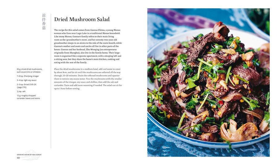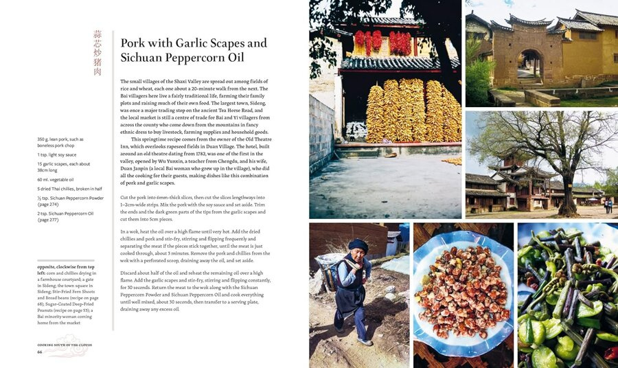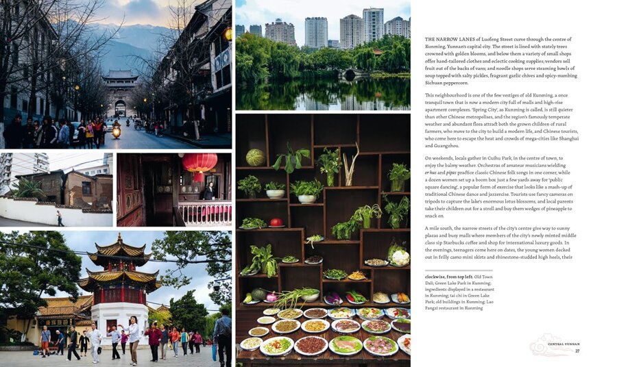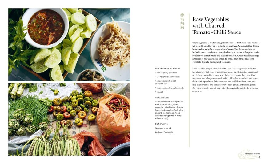 Each chapter in the book covers a different area featuring its classic recipes such as Tibetan momo dumplings from the north, grilled chicken with chillies and fresh herbs and the famed 'crossing-the-bridge' noodles from the south, fried rice with ham, potatoes, and peas from the east and roasted eggplant salad with tomatoes and herbs from the west, near the Burmese border.