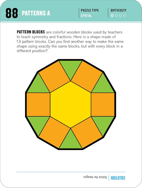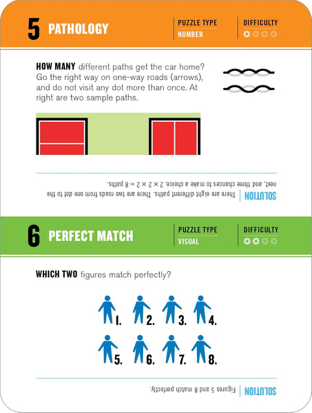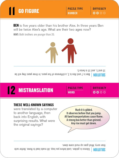 Put the pieces together in Assemblies. Deduce the secret word in Letter Swap, or untangle the mangled phrases of Lost in Translation. Plus discover cool twists on Sudoku, far-out ambigrams, Wordezoids, mazes, and number crunches. Answers are included upside-down at the bottom of each card.