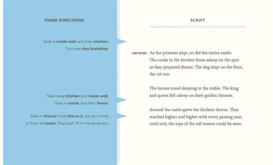 The theatre includes storage for the elements not in use, and an enclosed booklet contains instructions on how to stage your own performance of Sleeping Beauty for family and friends, including a script to follow. The Sleeping Beauty Theatre will be coveted by children and adults alike.