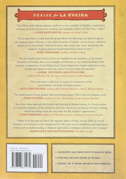 This is the most comprehensive authentic Italian cookbook ever published in the English language. With the prestigious Italian Academy of Cuisine as the author and more than 2,000 recipes, this has the greatest scope of any Italian cookbook. But it's also far-ranging in terms of geography. The book is divided into 8 chapters: Antipasti; Pizza and Sauces; Pasta, Polenta and Rice; Seafood; Meats and Poultry; Vegetables; Cheese; Sweets and Liqueurs All regions are covered: Apulia, Sicily, Sardinia, Abruzzi, Emilia-Romagna, Umbria, Tuscany, Veneto, Latium, Liguria, Calabria, Basilicata, Alto Adige, Campania, Friuli, Lombardy, Piedmont, Marche, Trentino, Molise