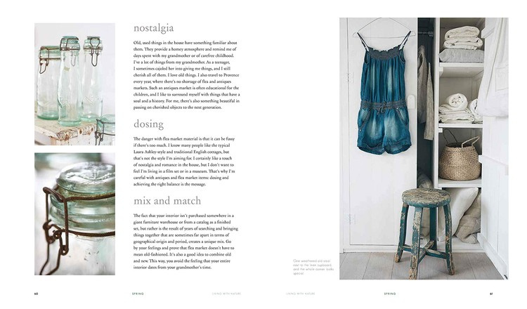 Author Marie Masureel is an interior stylist and photographer whose passion is varying home decor with repurposed elements and found objects from nature, season by season. For autumn, she gathers fallen leaves, seasonal berries, and rose hips for flower arrangements and wreaths. To welcome spring, she turns to a garland made of newly formed fern fronds, while in summer, wildflowers, shells, driftwood and other materials create an effortless bohemian beach look.