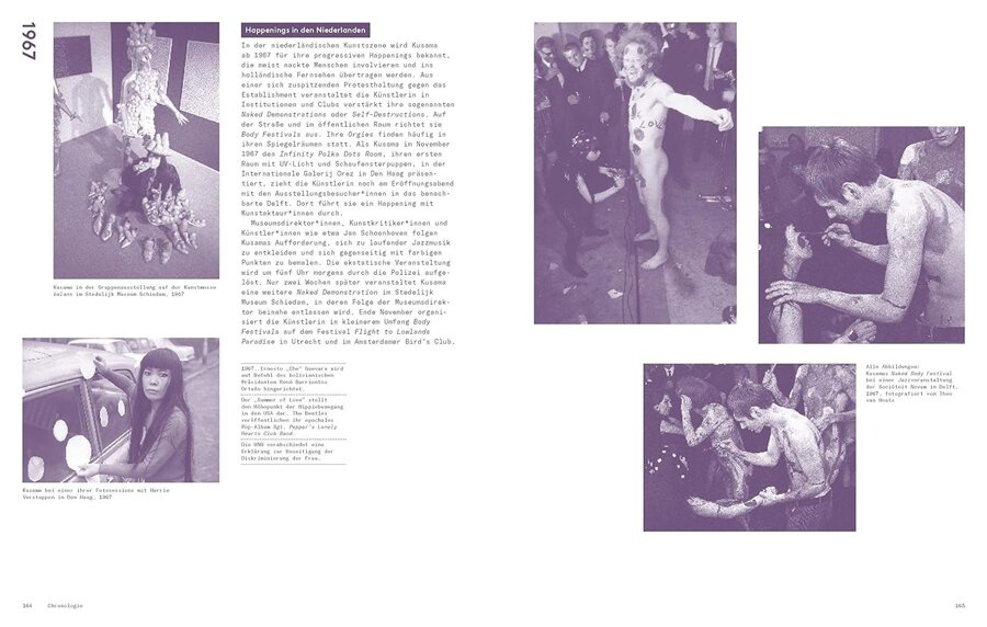 A diverse selection of images and archival documents feature alongside texts by authors from different theoretical backgrounds. Essays discuss Kusama's accomplishments in the worlds of fashion, film, art marketing and publishing. They focus on her engagement with different artistic spheres and offer genre-specific observations about her performances, installations and painting series.