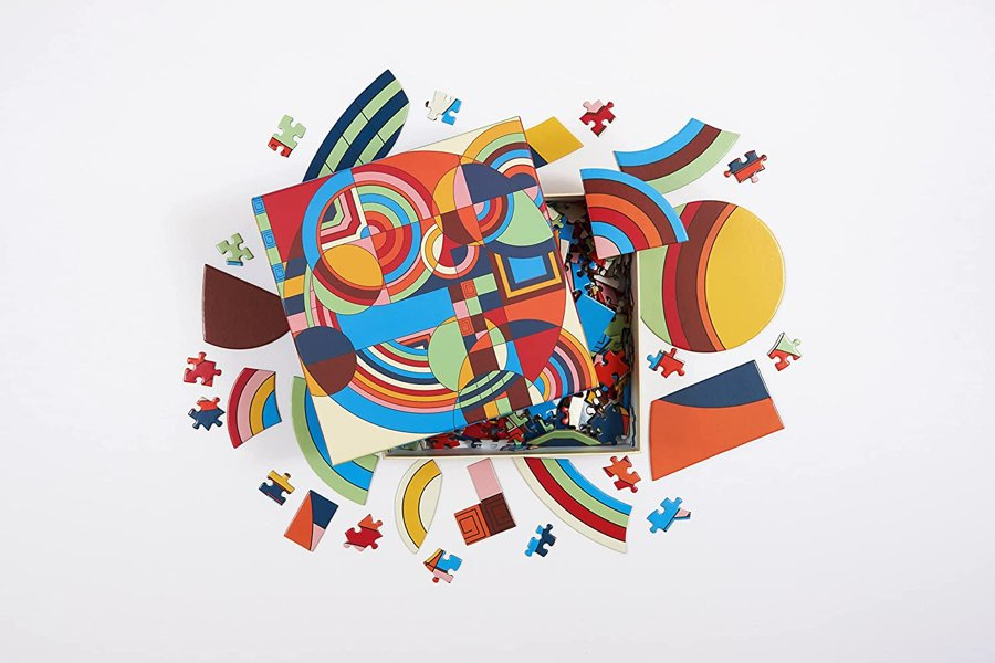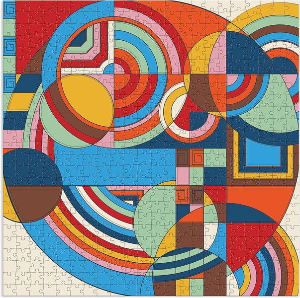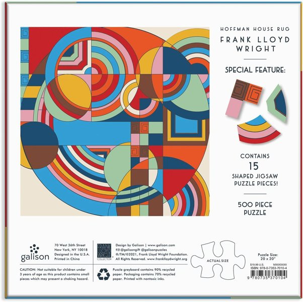 The Frank Lloyd Wright Hoffman House Rug 500 Piece Puzzle with Shaped Pieces features an iconic colorful geometric design from Wright. Galison puzzles are packaged in matte-finish sturdy boxes, perfect for gifting, reuse, and storage. An insert of the full puzzle image is also included.