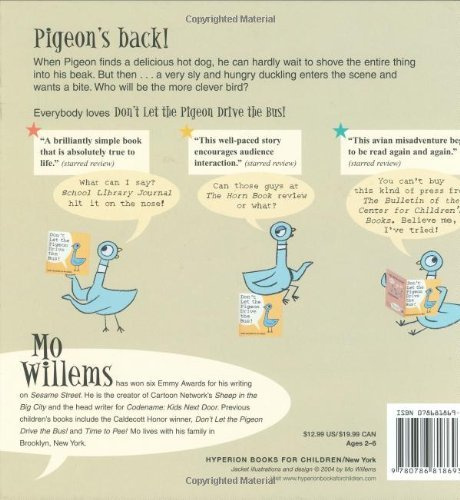 A hilarious picture book featuring the Pigeon, by the author of Don't Let the Pigeon Drive the Bus! and Time to Pee! In this hilarious, interactive read in Mo Willems' award-winning Pigeon series, the Pigeon discovers a delicious hot dog, and he can hardly wait to shove the entire thing in his beak. But then a hungry, clever little duckling enters the scene and wants a bite. Will he manage to outsmart the Pigeon and get his share of the hot dog? Oh, yes...