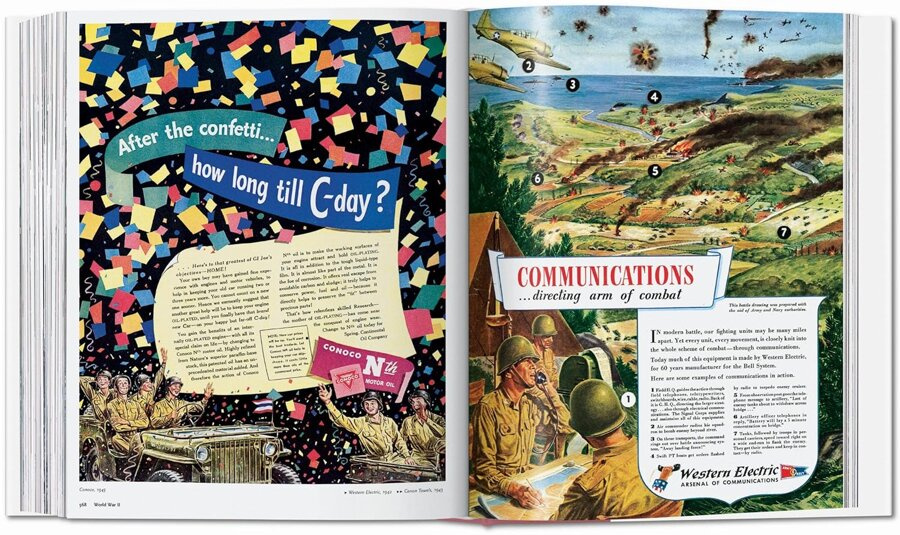 As America emerged victorious out of the darkness of World War II in 1945, the economic boom of the era helped usher in the most dramatic rise in quality of life, excess, and consumerism. The war's end also brought unprecedented pride and prosperity to the American people, and nothing reflects the new wave of consumerism and progress more than the ads of the time. Spending power dramatically increased in the decade's second half, with plentiful jobs and higher wages. Because of the new GI Bill, affordable housing was made available to returning war veterans for the first time.
