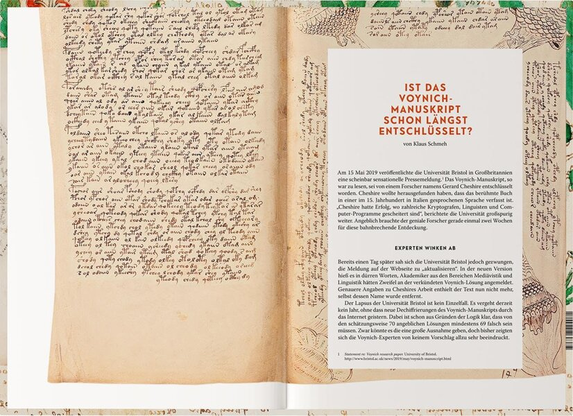 Das Manuskript ist inhaltlich noch immer ein Rätsel. Es enthält florale und anatomische sowie kosmologische, biologische und pharmazeutische Abteilungen mit wunderbaren Illustrationen, die geografisch nicht zweifelsfrei zugeordnet werden können; das Schriftbild gibt noch mehr Rätsel auf: Seit der Entdeckung 1912 ist es niemandem gelungen, den Text zu entschlüsseln. In regelmäßigen Abständen vermeldet jemand die Entschlüsselung, die sich aber stets als wissenschaftlich nicht haltbar erweist. Einige gefalzte Bögen-Lücken in der Paginierung zeigen, dass Seiten entnommen wurden. Unser Buch zeigt das gesamte erhaltene Manuskript mit allen sorgfältig gefertigten Zeichnungen und dem nicht zu entschlüsselnden Text. Anhand von zahlreichen Detail-Abbildungen und Close-Ups kann seine Schönheit noch einmal neu entdeckt werden. Ein Essay von Vera Pache führt in das Werk ein, durch den Einsatz grafischer Elemente wird der Leser durch das Buch geführt. Klaus Schmeh erläutert in seinem Essay die wichtigsten Entschlüsselungsversuche der vergangenen 100 Jahre. Das Original befindet sich unter der Katalognummer MS 408 im Bestand der Beinecke Rare Book and Manuscript Library der Yale University.