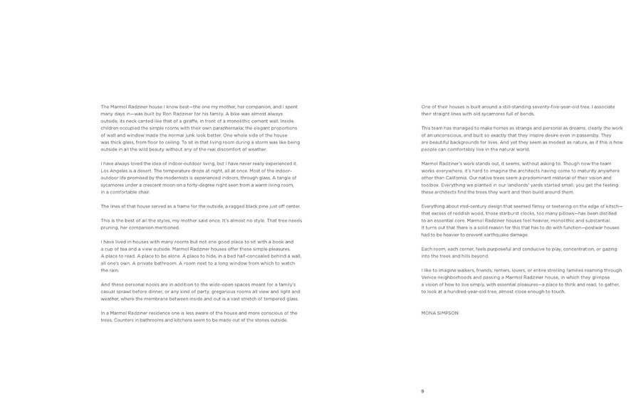 A foreword by novelist Mona Simpson provides a personal reflection on her experiences in a Marmol Radziner house, while an interview with Leo Marmol and Ron Radziner and detailed descriptions of their projects offer insights into the architects' philosophy and process.