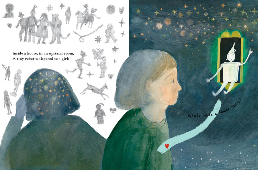 Set in a sleepy town on Christmas Eve, the story begins with a conversation between a girl and her toy robot, who wants to know what's inside a human heart. Describing it as a series of rooms filled with storybooks, the girl sets about building the robot a heart of its own by telling stories about the quiet little town she calls home.