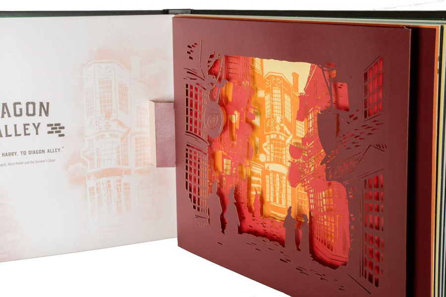 Revisit the magic of Harry Potter through four intricate, multilayered dioramas that capture beloved locations from the films. From Hogwarts to Hogsmeade, Diagon Alley, and the Ministry of Magic, each paper scene is laser die-cut for precision and gorgeously detailed. Every scene is accompanied by essential information about these magical places and fun, behind-the-scenes facts from the films.