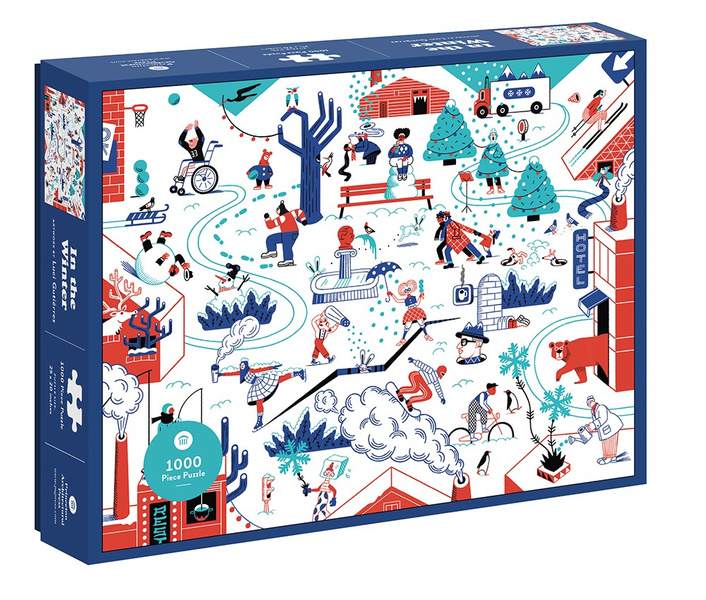 One moment in time on a perfect winter day: this 1000 piece puzzle is packed with a whimsical cast of low-temp characters, unexpected chilly details, and tons of cold-weather action. This richly layered puzzle contains almost every classic reason to love the wintertime, but each with an unexpected twist: a man rolls around in a snowball, Christmas trees sing, a skier goes up instead of down, a fox pours salt on the road. Spanish illustrator Luci Gutierrez brings her love of funny characters and fascinating details to the classic winter scene.