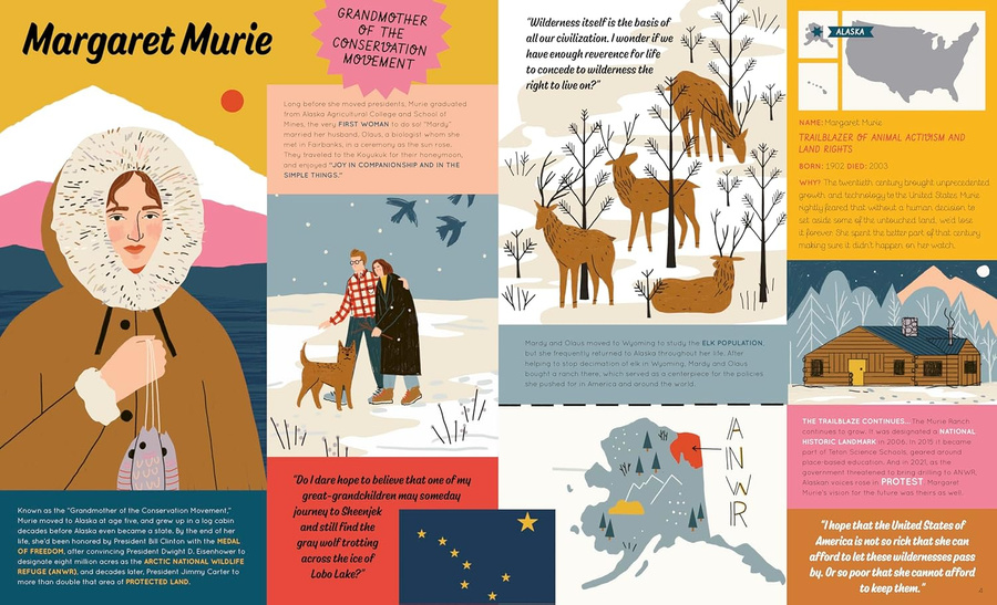 By honouring people who strove in the areas of equal rights, feminism and environmentalism/conservation, this fact-packed book celebrates what makes America great, then and now. Alabama: Rosa Parks; Alaska: Margaret Murie; Arizona: Cesar Chavez; Arkansas: All-American Redheads; California: Colin Kaepernick; Colorado: Corky Gonzales; Connecticut: Rebecca Lobo; Delaware: Joe Biden; Florida: Emma Gonzalez; Georgia: Jackie Robinson; Hawaii: Barack Obama; Idaho: Marilyn Schuler; Illinois: Betty Friedan; Indiana: Eugene V. Debs; Iowa: Carrie Chapman Catt; Kansas: William Allen White; Kentucky: Muhammad Ali; Louisiana: Norris Henderson; Maine: Dorothea Dix; Maryland: Thurgood Marshall; Massachusetts: W.E.B.