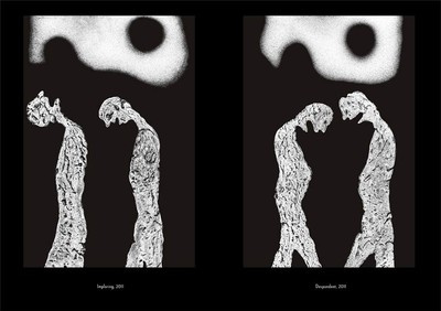 Inspired by the sight of hand-drawn carvings on blacked-out windows in an abandoned women's prison, Ballen started to experiment using different spray paints on glass and then 'drawing on' or removing the paint with a sharp object to let natural light through. The results are like prehistoric cave-paintings: the black, dimensionless spaces on the glass are canvases onto which Ballen carves his thoughts and emotions. Fossil-like facial forms and dismembered body parts co-exist uncomfortably with vaporous, ghost-like shadows - these images have the capacity to shock, inspire, amuse and even elate viewers.