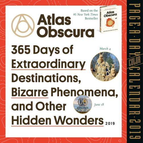 Adapted from the #1 New York Times bestselling book--and from the founders of AtlasObscura.com, the beloved website--the ATLAS OBSCURA PAGE-A-DAY CALENDAR captures the sensation of wanderlust in 365 days of stunning color photographs, unique facts, and unexpected adventures. Jaw-dropping natural wonders, like the Great Blue Hole, a 984-by-407 foot indigo-hued sinkhole in Belize. Eccentric attractions, like the Snake Charmers Procession in Cocullo, Italy, a tradition that dates back to the 14th century.